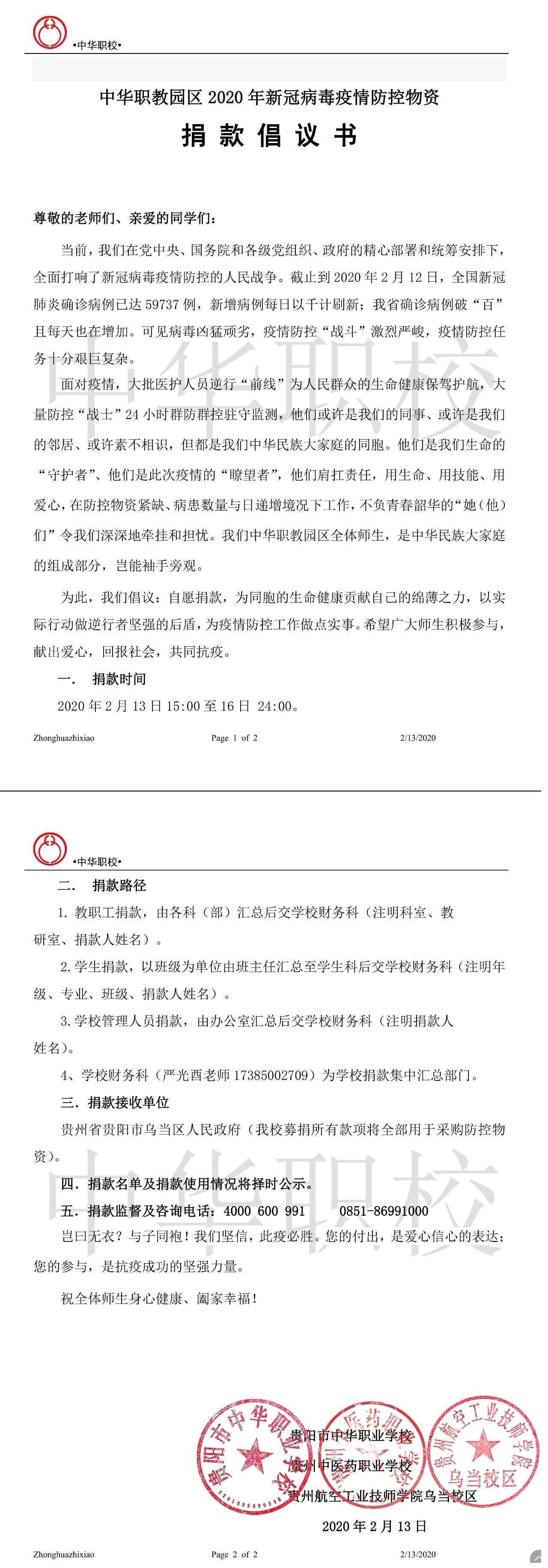 中华职教园区2020年新冠病毒疫情防控物资捐款倡